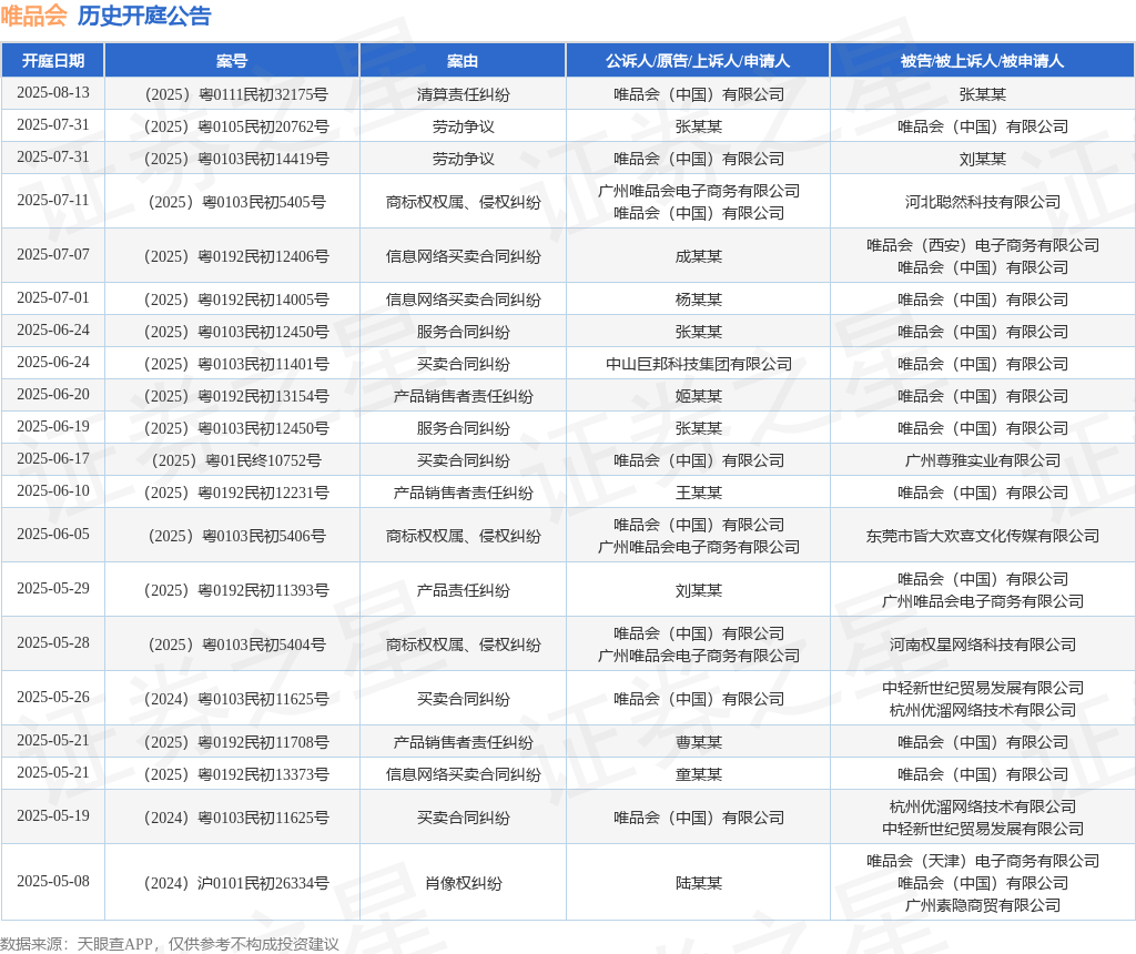 案号:(2025)粤0192民初13154号审理法院:广州互联网法院案由:产品销售者责任纠纷当事人信息: 原告/上诉人:姬某某 被告/被上诉人:唯品会(中国)有限公司开庭日期:2025年6月20日根据统计,近一年内以唯品会(中国)有限公司为当事人的历史开庭公告有108则,其中案由为“买卖合同纠纷”的公告以35则居首,其次为“侵害商标权纠纷”有15则,“信息网络买卖合同纠纷”有12则。历史开庭公告(前20条)如下: