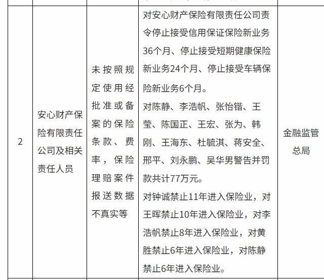 金融监管总局对安心保险责令停止接受信用保证保险新业务36个月、停止接受短期健康保险新业务24个月、停止接受车辆保险新业务6个月。