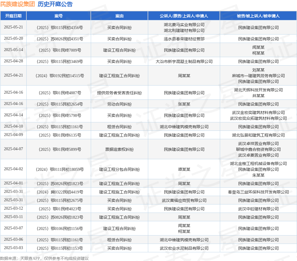 案号:(2025)鄂01民终7009号审理法院:湖北省武汉市中级人民法院案由:建设工程合同纠纷当事人信息: 原告/上诉人:民族建设集团有限公司 被告/被上诉人:闻某某、柯某某开庭日期:2025年5月14日根据统计,近一年内以民族建设集团有限公司为当事人的历史开庭公告有76则,其中案由为“买卖合同纠纷”的公告以23则居首,其次为“建设工程施工合同纠纷”有18则,“租赁合同纠纷”有8则。历史开庭公告(前20条)如下: